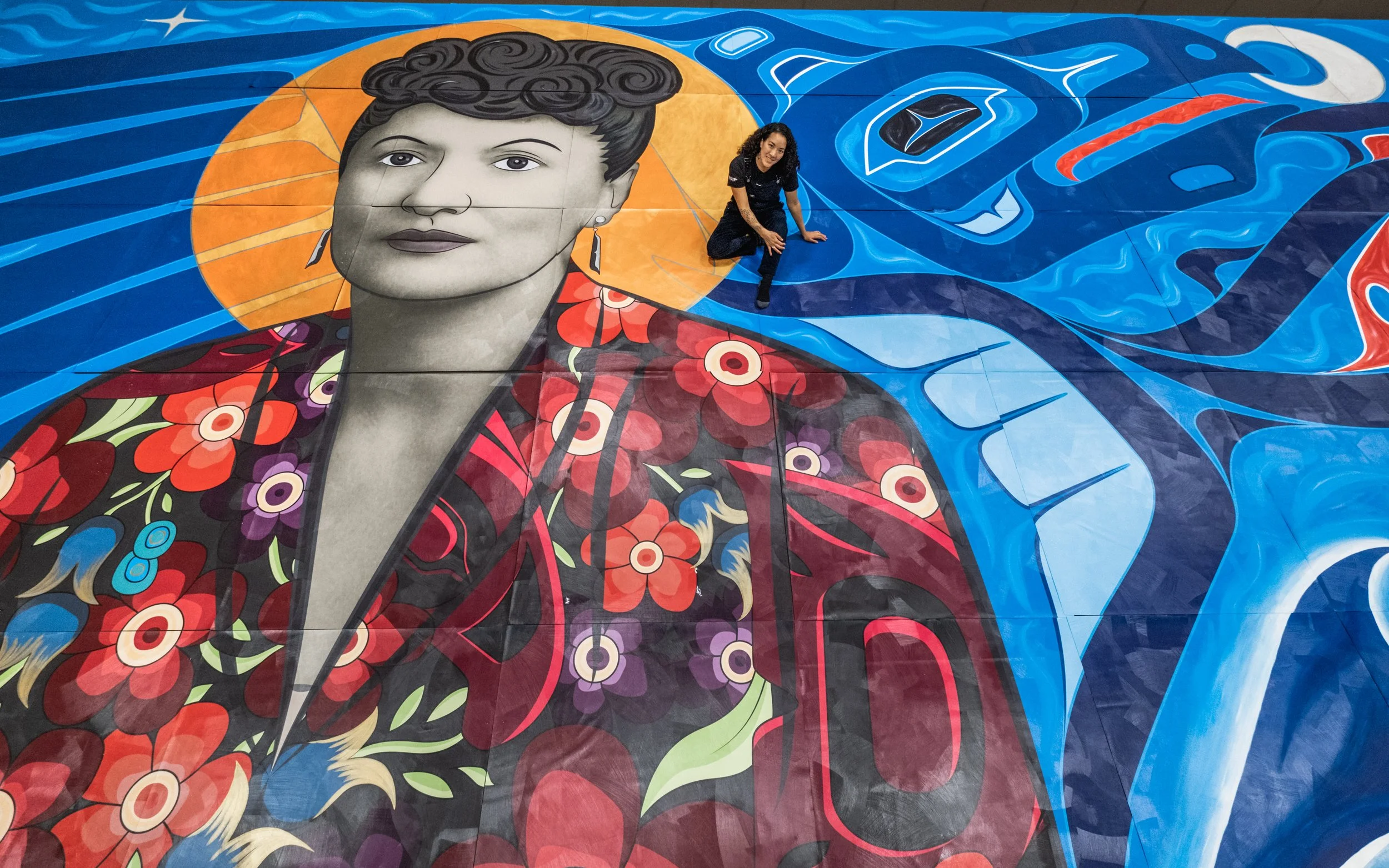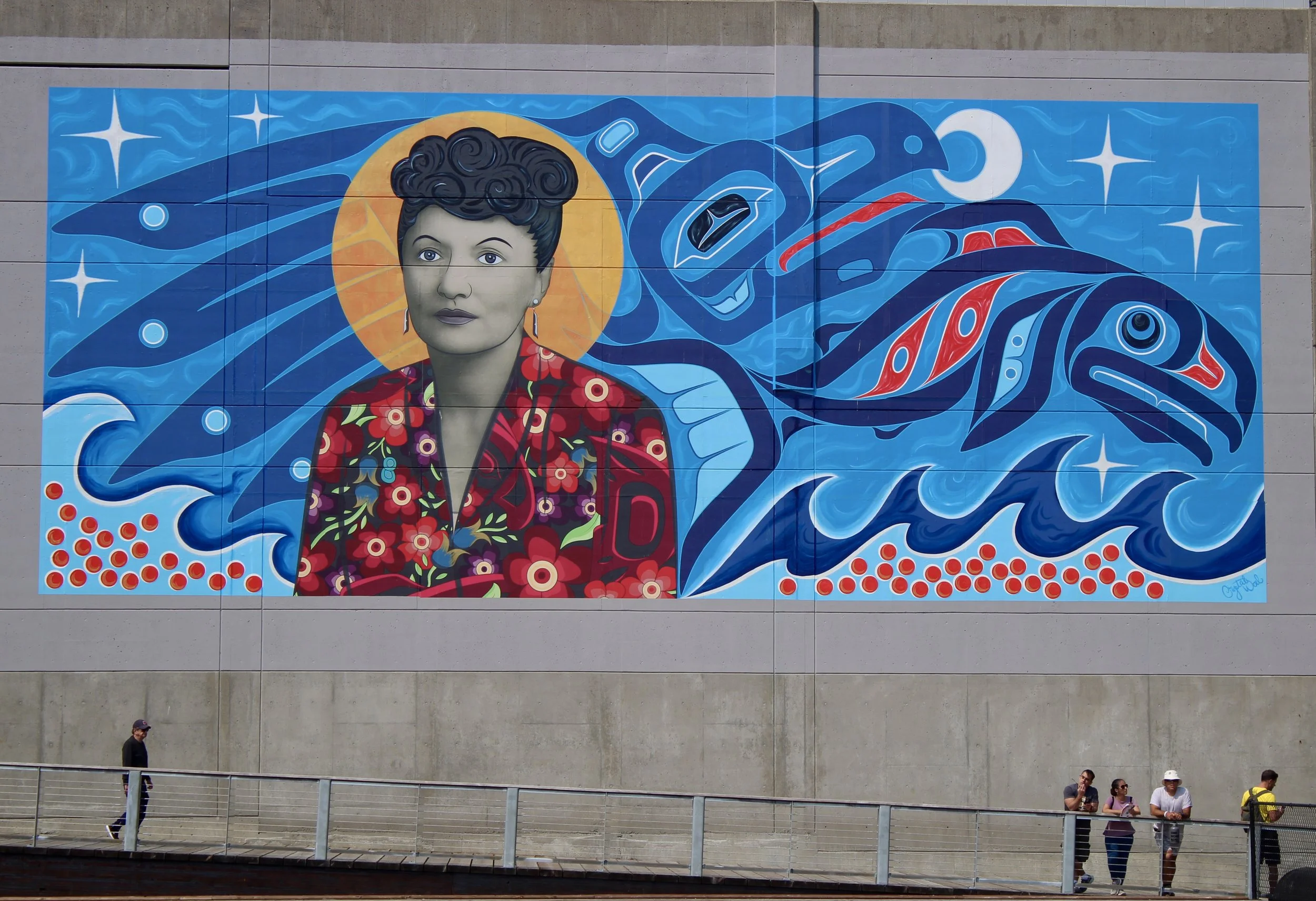 This mural was created to commemorate Elizabeth Kaax̱gal.aat Peratrovich, a Tlingit civil rights activist who worked for equality for Alaska Natives in the 1940s. She advocated and forged a way for the enactment of the State of Alaska’s Anti-Discrimination Act of 1945, one of the first anti-discrimination laws in the United States. I am proud to honor my fellow clan member of the Lukaax̱.ádi (Sockeye Salmon). She is located on downtown Juneau’s library wall facing the newly expanded dock on Áak'w Kwáan territory.